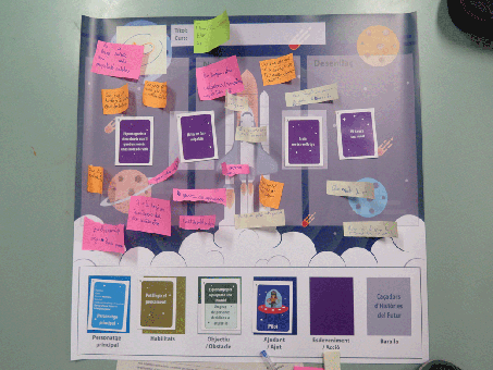 Nos tomamos la primera edición de Cazadores de Historias del Futuro como un proyecto con un importante componente de diseño, ya que el juego de mesa fue concebido desde cero para el proyecto y partíamos solo de unas ideas abstractas que fuimos refinando a través del trabajo en equipo de los investigadores, pero también a través de un proceso global de codiseño con cada uno de los centros. Aunque el juego inicial sería el mismo para los tres, necesitábamos conocer muy bien las características propias del centro y de los participantes antes de definir el punto de partida temático de la experiencia y cómo continuaríamos el trabajo de construcción de historias después del juego. Así pues, escogimos como momento para hacer la experiencia —que queríamos hacer de forma simultánea en los tres centros—, la Semana de la Ciencia de 2017 (a mediados de noviembre) y como marco temático el del turismo sostenible, tomando como premisa la creación de historias alrededor de turistas de origen extraterrestre que llegan a Barcelona con un objetivo concreto; un objetivo que, como otros elementos de cada historia, serían definidos a través del juego. Para materializar la historia diseñamos una serie de talleres adaptados para cada centro y grupo de edad, por lo que los participantes acabaron moldeando su propia historia en forma de cómic, en forma de storyboard, en forma de obra teatral o de relato digital en Instagram. Todo esto, que no es poco, en dos sesiones por grupo, aproximadamente unas cuatro horas que pasaron volando. Y terminamos esta primera experiencia con cerca de cincuenta historias colectivas, muy diferentes entre ellas, que junto con todo el proceso de documentación etnográfica, nos tienen en pleno proceso de clasificación y análisis.
