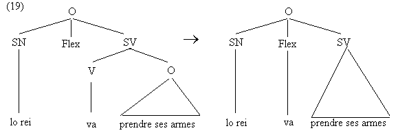 En la majoria de casos, el procés de descategorització s'atura en l'estadi segon o en el tercer. El verb anar, per exemple, s'ha convertit en un auxiliar de temps en la perífrasi de pretèrit perfet. En alguns casos, però, el verb gramaticalitzat pot arribar a fusionar-se totalment amb el verb principal i convertir-se en una simple desinència verbal. Un exemple prototípic, i citat sempre que es parla de processos de gramaticalització, és l'evolució històrica del verb habe en la construcció d'infinitiu final cantre habe, a partir de la qual es recrea el futur en la major part de les llengües romàniques. En llatí clàsic el verb habe és un verb principal amb semantisme ple (p. ex. dcere hoc habe tinc coses a dir), que es converteix en el llatí vulgar en un verb modal amb valor deòntic (p. ex. dcere habe he de dir). En català medieval, el derivat d'aquest verb es comporta com un afix verbal de futur que admet l'enclisi dels pronoms personals febles (p. ex. dir-t'ho-he). En català modern, finalment, ha esdevingut una desinència totalment fusionada al verb (p. ex. t'ho diré).La gramaticalització, com s'ha apuntat, no sols afecta el lexema que es descategoritza sinó el conjunt de la construcció sintàctica en la qual s'insereix. Des d'aquesta perspectiva, més globalitzadora i realista que no l'anterior, la construcció sintàctica experimenta un procés de reanàlisi que molt sovint elimina nodes sintagmàtics i trasllada les unitats gramaticalitzades cap a posicions estructurals més altes i de major abast sintàctic.(12) Com s'indica en (19), el verb anar, en convertir-se en auxiliar de passat, es trasllada des de la posició de nucli del SV a la posició de Flexió. Aquest trasllat provoca l'elisió de determinats nodes sintagmàtics i transforma la construcció bioracional originària en una construcció amb una única oració:
