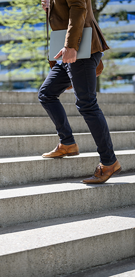 Home jove pujant escales amb un ordinador portàtil a la mà