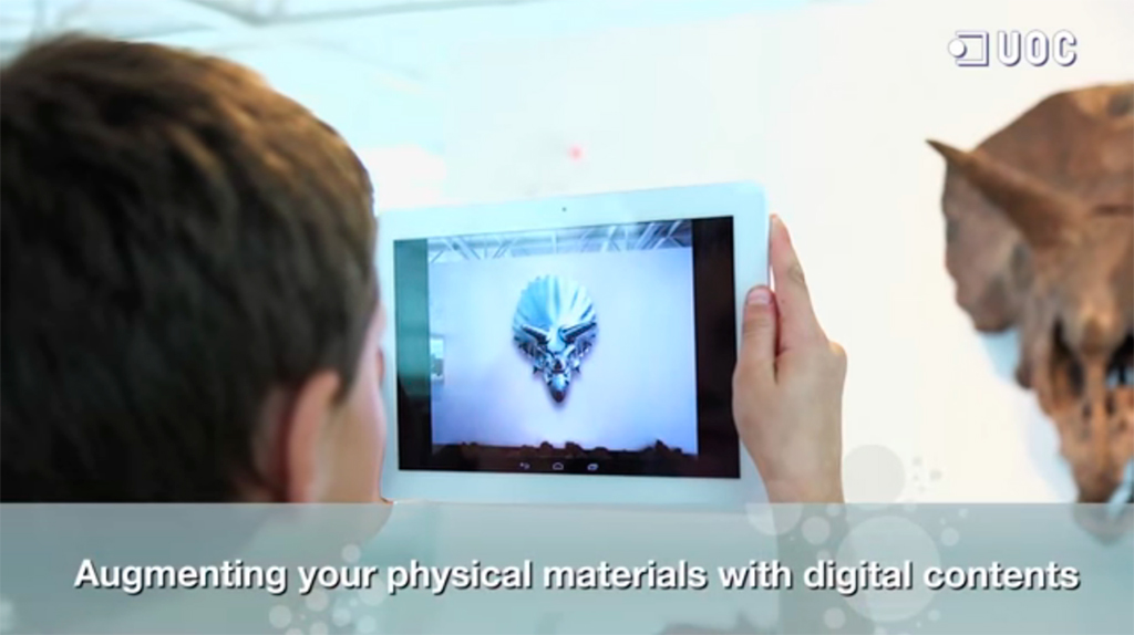 La realitat augmentada permet enriquir la visió del món real amb imatges virtuals. El seu ús cada vegada és més estès en diferents àmbits com la docència, el màrqueting, l'arquitectura, l'educació, el turisme i la medicina, entre altres. En el projecte UOC-CosmoCaixa (endegat el 2015), els visitants es poden descarregar una app, enfocar amb els seus dispositius mòbils el crani exposat del Triceratops horridus, un dinosaure de gairebé 10 metres de longitud i sis tones de pes, i experimentar com l'animal pren vida a partir del crani. Tant nens com adults, a banda, poden consultar materials relacionats d'altres dinosaures i admirar-ne l'envergadura.