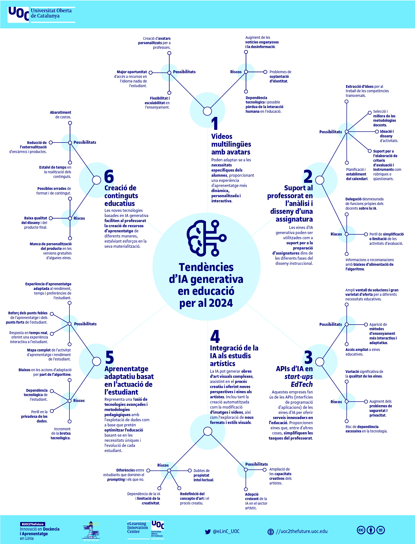 La proliferació de noves eines d'intel·ligència artificial (IA) generativa ha provocat una disrupció en diferents àmbits, i el panorama educatiu no n'ha quedat exempt. La gran popularitat i facilitat d'ús d'aquestes tecnologies, combinada amb les enormes possibilitats que ofereixen, ha donat pas a un seguit d'eines i aplicacions que obliguen a replantejar el desenvolupament pedagògic. Desirée Gómez Cardosa i Guillem Garcia Brustenga, experts en detecció i anàlisi de tendències de l'eLearning Innovation Center (eLinC) de la Universitat Oberta de Catalunya (UOC), detallen les principals tendències que involucren la IA en l'entorn educatiu i que veurem a les aules durant l'any que ara encetem. Un seguit de canvis que aportaran noves possibilitats de millora del procés educatiu, però que també tenen associats alguns riscos sobre els quals cal estar advertit.