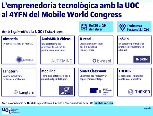 La fira de start-ups del Mobile World Congress (MWC), el 4 Years From Now (4YFN), tindrà, un any més, la participació de la Universitat Oberta de Catalunya (UOC). Sota l'empara de la Universitat, que ha format part de l'esdeveniment de manera ininterrompuda des dels inicis, l'any 2015, participaran en el 4YFN vuit projectes emprenedors que tenen el suport de la UOC a través de Hubbik, la seva plataforma d'impuls de l'emprenedoria. Del 26 al 29 de febrer, seran presents en un esdeveniment que reuneix centenars de start-ups i milers d'experts del sector a Fira de Barcelona Gran Via.