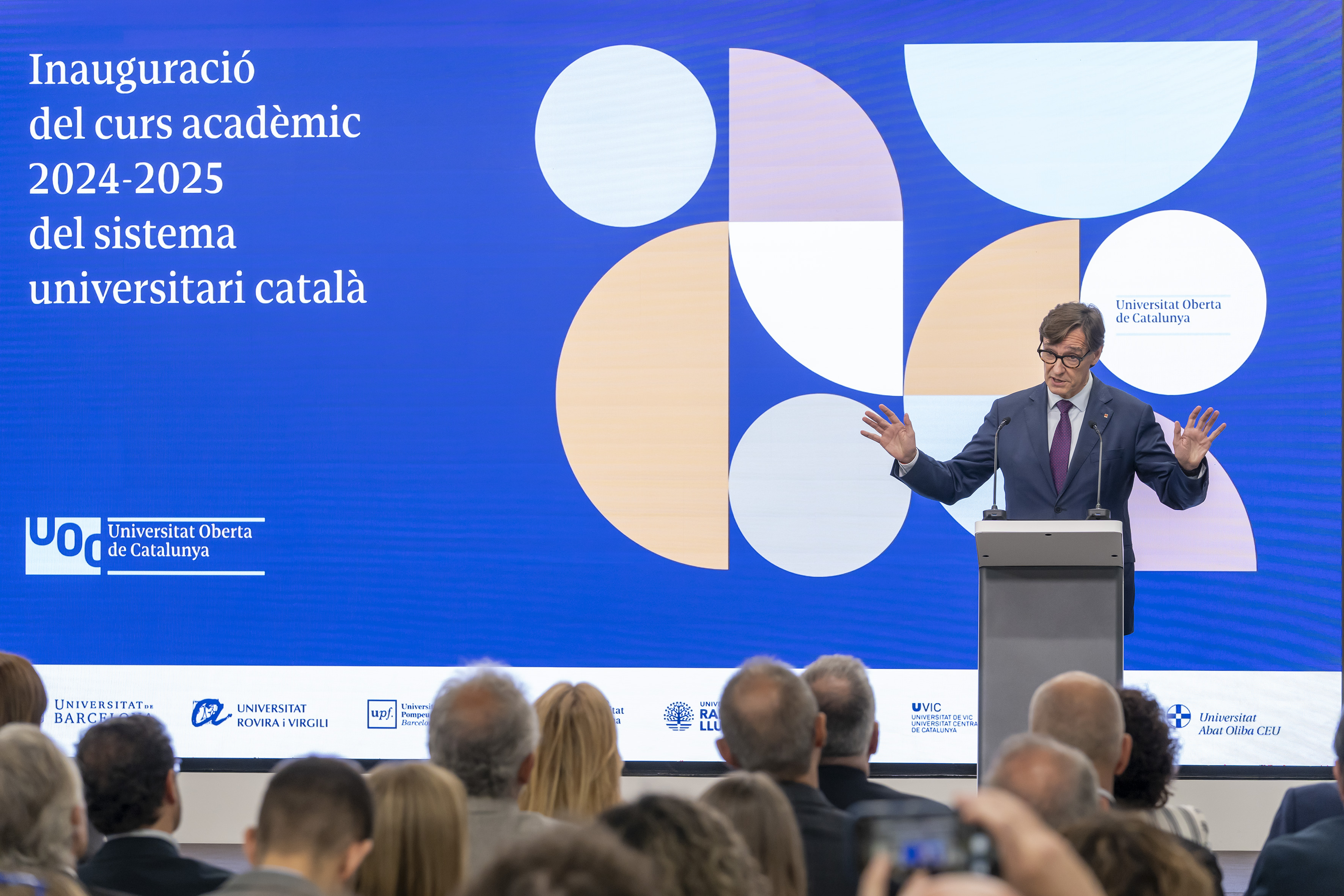 El curs acadèmic del sistema universitari català 2024-2025 ha quedat inaugurat aquest dijous, 3 d'octubre, en un acte presidit pel president de la Generalitat de Catalunya, Salvador Illa, i celebrat al campus UOC. La cerimònia ha comptat també amb la consellera de Recerca i Universitats, Núria Montserrat; la rectora de la UOC, Àngels Fitó, així com amb la resta de rectors de les universitats catalanes, autoritats i membres de la comunitat universitària. L'acte, que s'ha pogut seguir en directe, ha estat l'escenari del lliurament de les distincions Jaume Vicens Vives a la qualitat docent universitària i ha servit per aixecar el teló dels actes del trentè aniversari de la UOC.