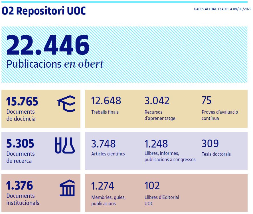 Actualment, l'O2 ja compta amb més de 22.000 publicacions en accés obert, de les quals més de 15.700 corresponen a publicacions de docència, més de 5.300 a recerca i més de 1.300 a documents institucionals. A continuació, podeu consultar una infografia que il·lustra més detalladament la distribució d'aquestes publicacions: