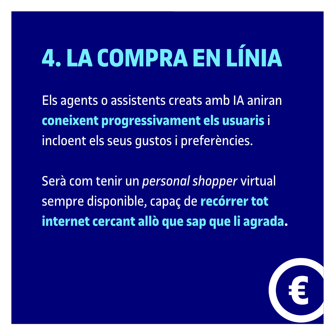 El comerç electrònic no deixa de créixer arreu del món. Però la irrupció de la IA a internet també canviarà la manera de comprar en línia. El professor destaca que aquests agents o assistents aniran coneixent progressivament els usuaris i incloent els seus gustos i preferències. Serà com tenir un personal shopper virtual sempre disponible, capaç de guiar-te a la botiga física o en línia i de recórrer tot internet cercant allò que sap que t'agrada.