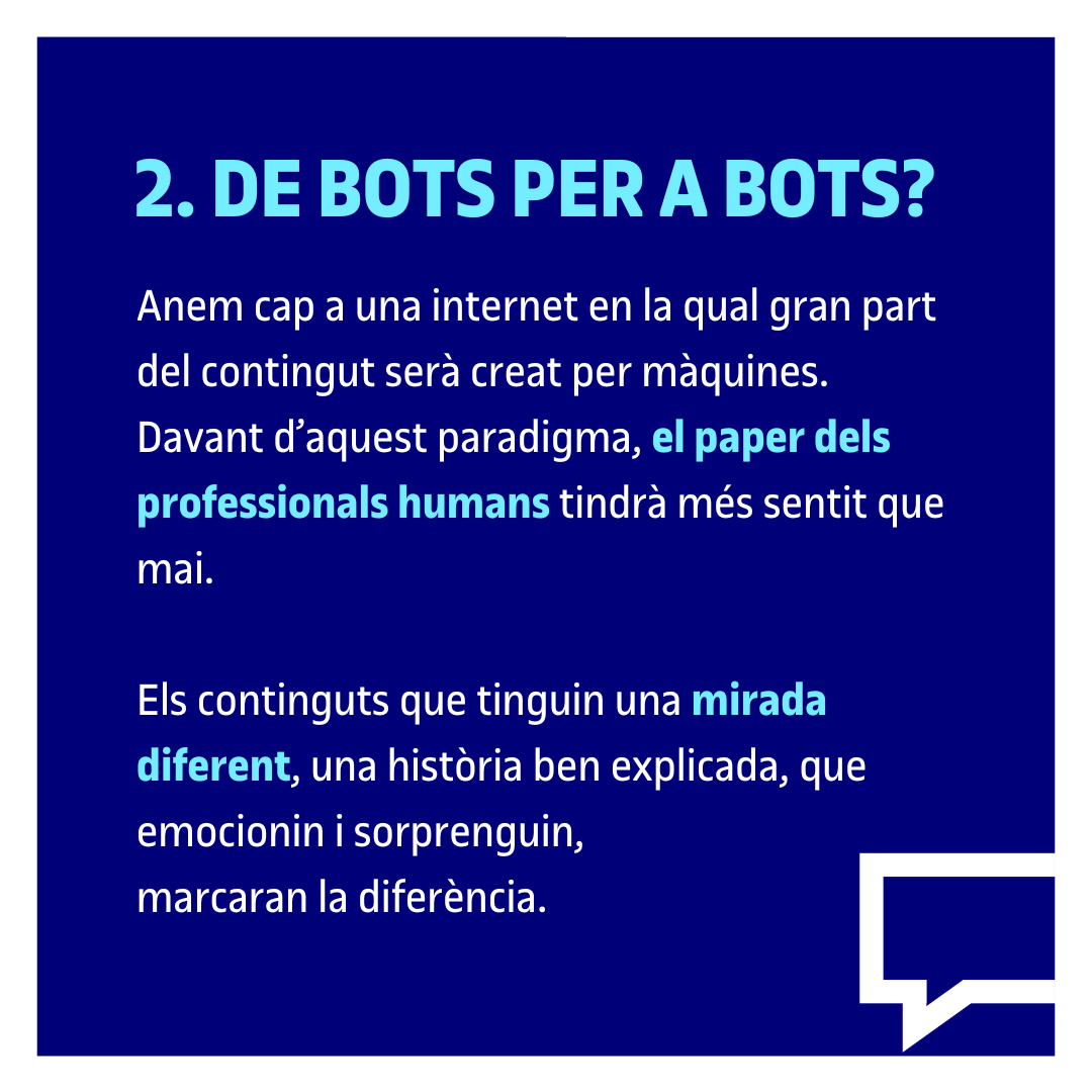 En aquest sentit, en un món d'automatització i IA generativa, el paper dels professionals humans tindrà més sentit que mai. "Allò que tingui una mirada diferent, una història ben explicada o una opinió fonamentada; el que emocioni, sorprengui o simplement faci pensar, aquí és on els humans, secundats per la IA, tornarem a marcar la diferència", subratlla sobre un repte que recaurà, especialment, en els mitjans de comunicació. "Hauran de reinventar-se perquè ja no n'hi ha prou amb informar; cal oferir context, interpretació i confiança, i diferenciar-se, perquè si tot sona igual, ningú escolta", explica.