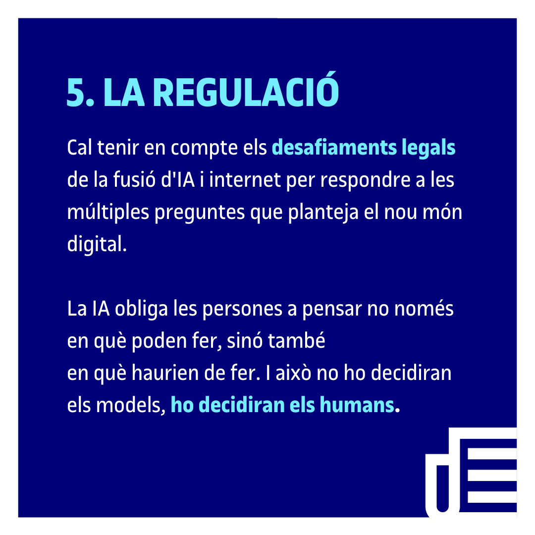 Amb aquest panorama, el dubte que sorgeix és què passarà amb la regulació. "La història es repeteix. La tecnologia va per davant i la regulació corre darrere", reconeix l'expert, que ho considera un procés normal. "No es pot legislar el que encara no es comprèn del tot", assumeix, però convida a tenir en compte els desafiaments legals d'aquesta fusió d'IA i internet per respondre a les múltiples preguntes que genera el nou món digital. "La IA ens obliga a pensar no només en què podem fer, sinó en què hauríem de fer. I això no ho decidiran els models, ho decidirem nosaltres", conclou.