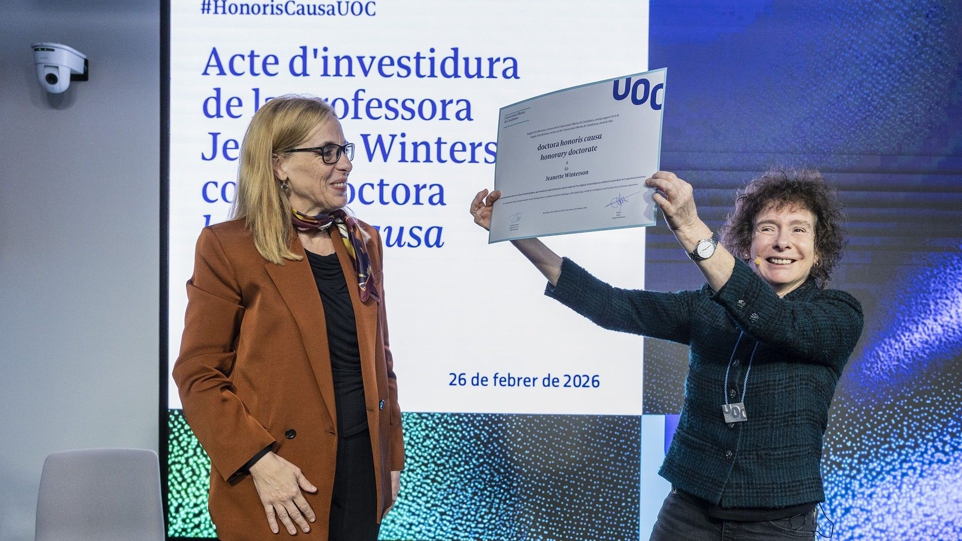 Jeanette Winterson (Manchester, 1959), una de les autores britàniques més influents del segle XXI, ha estat investida doctora honoris causa per la UOC en una gala celebrada aquest dijous, 26 de febrer, al Campus de la institució a Barcelona. L'acte s’ha convertit en una defensa dels valors de la universitat com són el de la imaginació i la possibilitat de canvi a partir d’una tecnologia que estigui al servei del futur i d’un món millor, allunyant d’interessos espuris. Winterson s’ha dirigit a l’auditori per reivindicar que “tot comença com un acte d’imaginació” humana i a “una visió d’algun tipus” sobre la realitat, que pot ser canviada “per progressar”. Com a exemple ha posat la seu de la UOC al Poblenou, “un lloc amb un passat industrial que ara és una edificació pel futur, on els estudiants poden trobar-se en línia”, demostrant com la tecnologia pot “fer avançar el món”.