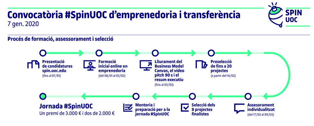 El procés d’inscripció de propostes comença amb la publicació d’aquestes bases i es tancarà el 7 de gener de 2020. En cas que tingueu un projecte que compleixi els criteris #SpinUOC, només cal que ompliu aquest formulari en línia i que el presenteu.