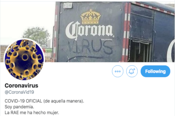 «Vinc d’una família desestructurada: mare verge, pare colom i dormint en un pessebre»; «Líder suprem de la Corea bona, la del Nord, la fetén. Soc dels que s’apunten a un bombardeig», o «COVID-19 oficial (d’aquella manera). Soc pandèmia. La RAE m’ha fet dona» són descripcions de comptes de Twitter que corresponen a alguns dels principals personatges paròdics (prefereixo aquest terme a compte paròdia) en espanyol de l’actualitat. Són, respectivament, @diostuitero (més de 536.000 seguidors), @norcoreano (més d’un milió de seguidors) i @coronavid19 (prop de 873.000 seguidors). Es tracta de tres exponents de personatges paròdics d’èxit a Twitter clarament diferents entre si: un d’ells és una divinitat, l’altre parodia un personatge actual (això sí, d’un país llunyà) i l’altre és un virus.