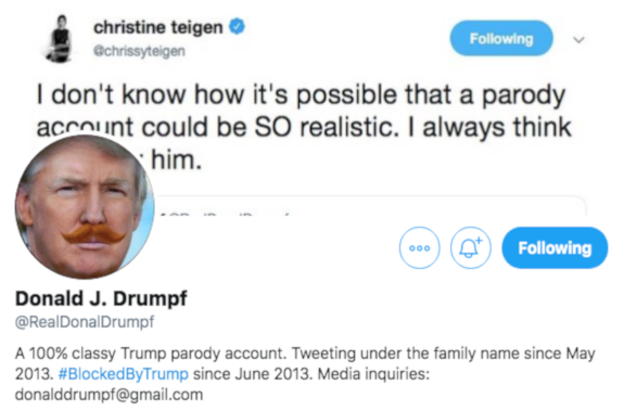 A la banda oposada de l’espectre, la paròdia es pot exercir com a crítica adreçada al mateix personatge, exagerant els seus trets més polèmics (opcions polítiques o religioses, declaracions o accions discutides, forma d’expressió, background). Aquest tipus de sàtira es dirigeix normalment cap a personatges públics contemporanis, dins o fora del seu context. Serà, així, molt diferent l’humor del compte paròdia de Donald Trump en castellà @magnate:USA del de @RealDonalDrumpf, un dels més populars a Estats Units. El que resulta curiós (això ho deixo per a una altra ocasió) és que tots dos tenen un nombre de seguidors molt similar, una mica per sobre dels 100.000. I en un terreny intermedi, i per això el més problemàtic, se situen paròdies menys extremes, aparentment més subtils, però que precisament per això poden generar confusió amb els perfils reals, encara que es presentin en xarxes socials com a paròdia.