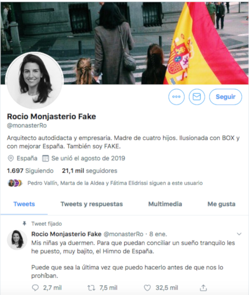 «Así es ‘Rocío Monjasterio Fake’, la cuenta falsa que se la ha ‘colado’ a muchos y ridiculiza a Vox»: https://www.elespanol.com/social/20200119/rocio-monjasterio-fake-cuenta-colado-ridiculiza-vox/460454437_0.html