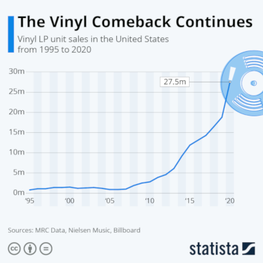 El reportatge inclou dades de 2015 prou significatives: així, Musicwatch indicava que més de la meitat de compradors de vinil es trobaven per sota dels vint-i-cinc anys, i en aquell any les vendes de vinil havien pujat un 32%, fins als 416 milions de dòlars, el nivell més alt des de 1988 (moment en què l’ara menyspreat CD estava encara en una posició de mercat ascendent). Acostant-nos una mica més a l’actualitat, Statista referma la tendència a l’alça imparable de la venda de vinils, com mostra el seu gràfic evolutiu circumscrit als EUA: el 2020 les vendes s’havien enfilat fins als 27,5 milions d’unitats, fet que suposa un increment del 46% respecte a l’any anterior (segons el gràfic, el 2015 ens situaríem a prop dels 12 milions, perquè ens en fem una idea amb relació a les dades de Musicwatch).