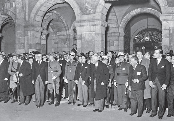 Inauguració del Parlament de Catalunya, el 6 de desembre de 1932; les autoritats esperen els automòbils a la sortida, i Dalmau Costa, quart per l’esquerra, supervisa l’operació a prop del president Macià, el general Batet, Lluís Companys i Josep Tarradellas, entre altres