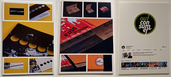 Dintre del segon grup, hi ha les entrades per a les festes de final de curs de l’escola Eina Eina es crema (2005) i Eclipsi (2006) –una de les meves peces favorites– juntament amb Projeccions (2008), en la qual es fa servir l’encunyació d’una manera creativa i juganera per visionar o trobar coses amagades. També ho són el disseny dels catàlegs L’observació i el traç (2008), amb il·lustracions botàniques de Joaquim Conca, i el desenvolupament del logotip per a Outconsumer (2008), la marca personal del periodista i youtuber Roc Massaguer. Treballs, doncs, que donen compte d’una trajectòria de disseny gràfic força variada i completa.
