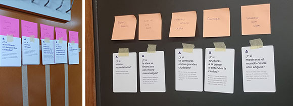 Després d’un preàmbul teòric/pràctic sobre el funcionament d’aquest recurs per a l’estimulació creativa, es van repartir cinc cartes a cada equip, amb l’objectiu únic que cerquessin una relació entre la proposta inicial triada (per exemple, un ecoparc) amb la targeta rebuda (per exemple, «I si mostressis el món des d’un altre angle?»). A més, en aquest repartiment de cartes, cadascuna de les targetes s’associava directament –i de manera aleatòria– amb una nota adhesiva, per la qual cosa es generava una relació forçada amb la qual caldria treballar.