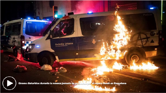 De vegades, però, se superen els murs del sofriment virtualitzat de les ficcions que consumim en sèrie, i el malestar travessa les pantalles i es manifesta als carrers. Els carrers de les ciutats més plàcides s’inflamen. Una nit del febrer del 2021 ens arribaven dures imatges de disturbis als carrers de Barcelona i d’altres ciutats espanyoles en protesta per la detenció del raper Pablo Hasél pels delictes d’enaltiment del terrorisme i d’injúries a la Corona i altres institucions de l’Estat. En el cas barceloní, d’una concentració pacífica en una plaça del barri de Gràcia, es passava a una successió de gestos d’ira descontrolada, amb cremes de contenidors i saquejos de botigues, segurament sobredimensionats per l’allau d’infiltrats i de joves sense altra ideologia que el ressentiment. Una multitud de col·lectius expulsats de la vida digna expressaven una violència-odi que resultava d’una violència-opressió. La violència, íntima i biopolítica, esdevé tant virtual com col·lectiva un cop es televisa i es viralitza a les xarxes.