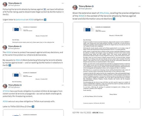 En aquest context, des de la UE, s’han trobat amb una situació que pot crear precedents sobre l’eficàcia de la nova normativa aprovada que cerca, entre altres efectes, combatre la desinformació i la presència de continguts il·lícits en l’entorn digital. Això ha portat al fet que el comissari europeu de Mercat Interior i Serveis, Thierry Breton, hagi fet públiques cartes a les principals plataformes de mitjans socials (com Meta, X, TikTok…) perquè controlin la difusió d’aquesta mena de continguts, especialment per la urgència i gravetat dels esdeveniments desenvolupats en el conflicte a Israel.