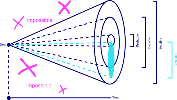 Interpretació pròpia del con de futurs (Voros, 2003), sobre imatge de l’entrada «Disseny Especulatiu» del ‘Design Toolkit’
