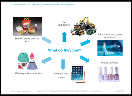 Tot i que no acostumen a tenir gaires diners, els productes més desitjats i comprats pels nens són joguines, menjar ràpid, oci, productes de bellesa, roba i accessoris o tablets i smartphones.