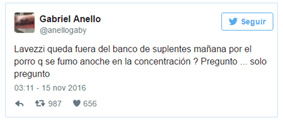 Diuen que els grans rumors, com els grans rockers, mai no moren. S’esvaeixen com el fum, entre calades de temps, però tornen a activar-se quan l’entorn els reclama. Més ben dit, quan hi ha algú que els torna a activar. En aquest cas, la persona que va detonar el rumor sobre Lavezzi va ser el comunicador Gabriel Anello amb aquesta piulada: