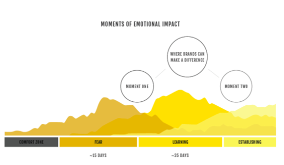 3. Aprenentatge i ajust. Una fase de cinc setmanes en què els individus canvien d’hàbits i s’adapten a un nou estil de vida. Actualment molts consumidors es troben en aquesta fase. És aquí on les empreses tenen l'oportunitat de formar part de la nova vida quotidiana dels consumidors, ja que els poden facilitar la manera de retrobar el control i la calma.