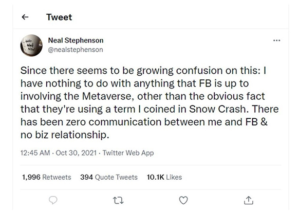 Tuit de Neal Stephenson del 30 de octubre de 2021