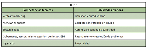 Si nos fijamos en las características que las agencias valoran de sus trabajadores, este mismo informe afirma que las competencias técnicas más apreciadas son las ventas y el marketing, la atención al público, la sostenibilidad, la gobernanza, el asesoramiento y la gestión de riesgos ESG (environmental, social and governance) y la ingeniería. Por otro lado, las habilidades blandas más buscadas serían la fiabilidad y la autodisciplina, la colaboración y el trabajo en equipo, el aprendizaje continuo y la curiosidad, el razonamiento y la resolución de problemas, y la proactividad.