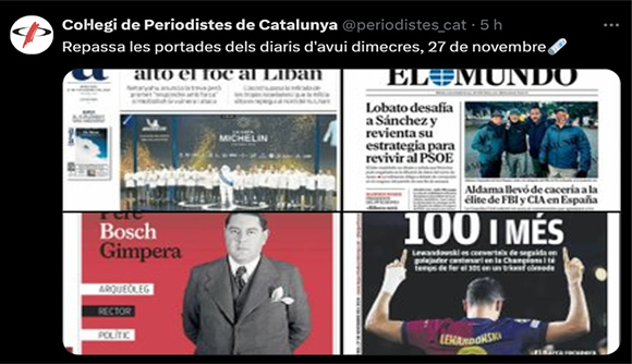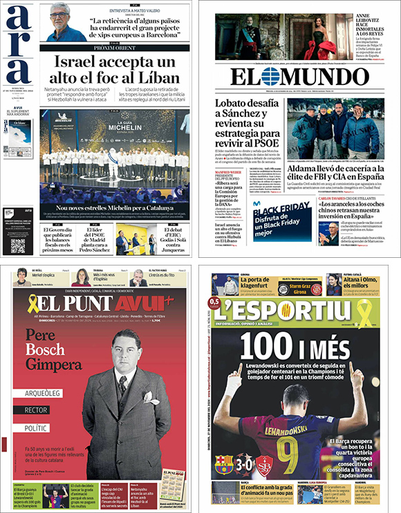 Fijémonos en los contenidos que aparecen en las portadas del pasado 27 de noviembre, según el repaso que hace el Colegio de Periodistas de Cataluña, y podremos ver los temas que la configuran.