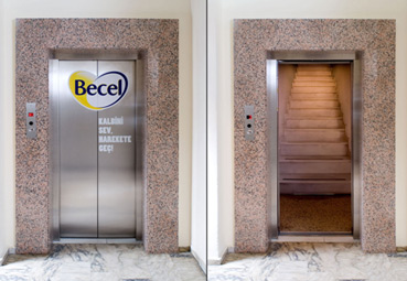 -Hola.-Hola, ¿otra vez vas a Administración? -Sí, hoy no paro, arriba y abajo... aunque debería ir por las escaleras con “esto” que han puesto. – “Esto” es de una margarina, ¿verdad? -Sí, diría que sí, pero no me hagas caso, que a mí, la publicidad... -A mí tampoco, pero el efecto es muy real. -Sí, me recuerda a aquella técnica que estudiábamos en Historia del Arte, ¿cómo se llamaba? – Sí, sé a lo que te refieres, pero tampoco me acuerdo… luego se lo pregunto a una compañera de la quinta planta, que seguro que lo sabe, y te lo digo a la hora del café .-De acuerdo, hasta luego, guapa.