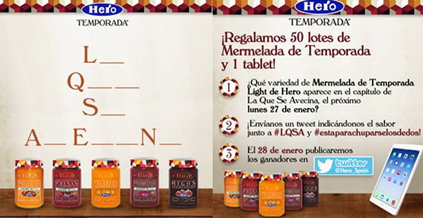 Sábado 25 de enero: Hero desvela en Facebook la primera pista. “Este lunes nuestra Mermelada de Temporada Hero aparecerá en una de las series de moda de la televisión. Haz clic en ‘me gusta’ si tú también sabes a cuál nos referimos [el mensaje se acompaña de una imagen que invita al lector a completar un ahorcado]. ¡Atent@s, que venimos con sorpresa!”. A mil de los más de cien mil fans de la página de Hero España les gustó esta publicación, que generó a su vez más de cuatrocientos comentarios. La comunidad de Hero en Facebook intuye la que se avecina. Mensajes similares se difunden, en paralelo, a través de Twitter, red social en la que @Hero_Spain apenas cuenta con mil seguidores y en la que los mensajes pasan, inicialmente, casi desapercibidos.