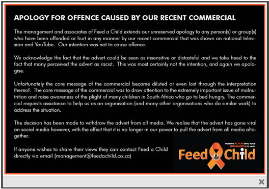 Prácticamente al mismo tiempo que ocurrían estos hechos, en Sudáfrica la ONG Feed a Child lanzó un spot en la televisión de aquel país y en YouTube para recaudar fondos contra el hambre infantil. El anuncio mostraba a una mujer blanca de clase alta tratando a un niño de color como si fuera un perrito. El mensaje que quería trasmitir la organización con este spot es que un perro doméstico está, como promedio, mejor alimentado que los millones de niños sudafricanos que pasan hambre a diario.