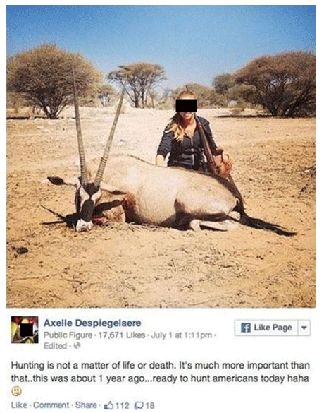 Con una agilidad digna de mejor causa, la multinacional cosmética L’Oréal fichó a la menor como imagen de la marca para aprovechar su repentina fama. Sin embargo, apenas se anunció el fichaje las redes sociales regurgitaron una fotografía en la que Axelle aparecía, rifle al hombro, con un antílope muerto a sus pies tras participar en un –al parecer– exitoso safari en África. Del todo inapropiado para una empresa que se vanagloria de haber erradicado los test con animales y que ha donado cifras millonarias a los activistas que combaten el maltrato animal. La colaboración entre L’Oréal y la joven belga se frenó en seco, aunque al escribir este artículo el vídeo que Axelle llegó a grabar para la compañía aún es
