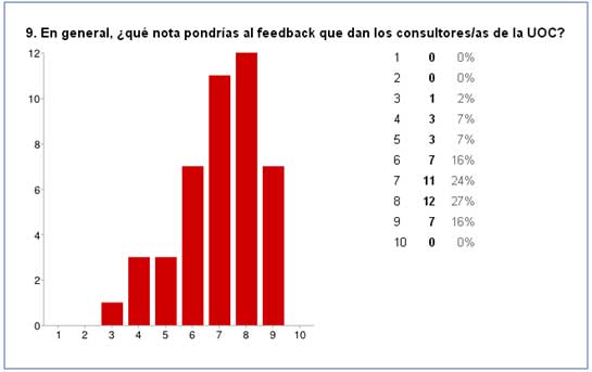 “Este semestre, sin ir más lejos, he tenido profesores que se merecen un 10 en el aspecto del feedback realizado y del exhaustivo análisis y evaluación que hacen de cada una de las PEC, y otros que no pasarían del 2. Como que esta última no es la norma general (visto en retrospectiva por los semestres que ya llevo cursados) opto para puntuar con un 7 el nivel general de feedback ofrecido”.