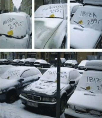 Por ejemplo, si el termómetro marca negativo y tienes una agencia de viajes con unas ofertas espectaculares para lugares cálidos, puedes reforzar el reparto de fliers sin aumentar el presupuesto (y siempre que las ordenanzas municipales permitan el uso publicitario de los vehículos estacionados en la calle). Solo te hace falta un repartidor con unos buenos guantes, magnífica predisposición y letra clara.