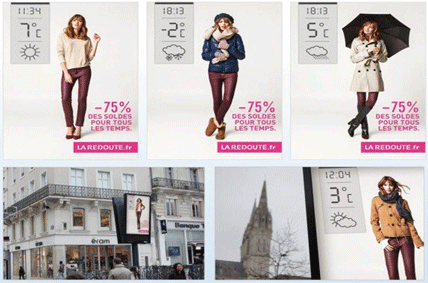 Cuando el presupuesto no es ningún problema, se puede poner la tecnología al servicio de la creatividad y apostar por unos anuncios que cambien en función de la temperatura exterior. Es el caso de esta centenaria marca de venta de ropa (antes por correspondencia, ahora digital), que optó para cambiar el outfit de la modelo según la temperatura real que hacía en las calles de París.