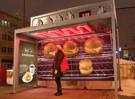 Si hace frío, se puede convertir la parada de un autobús en un horno con grill que realmente calienta para recordar que hay un establecimiento cercano donde hacen unos menús muy reconfortantes.