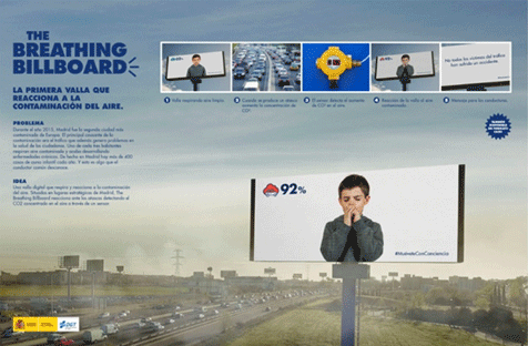 La primera valla que reacciona a la contaminación del aire ganó un Sol de bronce dentro de la categoría de Publicidad Digital Exterior. De hecho, quien reaccionaba era un niño que se veía en la valla-pantalla y que empezaba a toser cuando los niveles de emisiones nocivas eran elevados. Se representaba así a uno de los cuatrocientos nuevos casos de asma infantil que cada año se diagnostican en Madrid. Pero El Sol de cada primavera nos ha traído todavía más ejemplos de publicidad brillante: no os perdáis el palmarés completo.