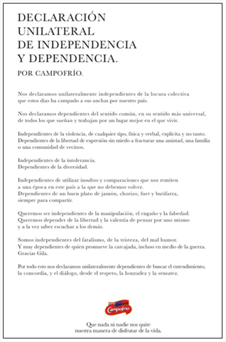 La empresa Campofrío, fiel a la línea de comunicación que sigue desde hace tiempo, perfectamente dibujada en el humor crítico, publicó este anuncio en