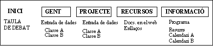 La interfície que presentem aquí breument –la dels estudiants– es divideix en cinc seccions: Inici, Gent, Projectes, Recursos i Informació. Les seccions miren de traduir la metàfora que s'ha adoptat.
