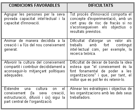Hi ha consens sobre quines han de ser les condicions que facilitin una cultura del coneixement en l'organització, com també sobre les principals dificultats per a implantar-ho, tal com es presenta al següent quadre: