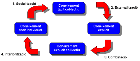El model de procés de creació del coneixement de Nonaka i Takeuchi (1995) descriu el cicle de generació de coneixement a les organitzacions mitjançant quatre fases (vegeu la figura 1): (1) socialització –els treballadors comparteixen experiències i idees, el coneixement tàcit individual es transforma en col·lectiu–, (2) externalització –el coneixement tàcit col·lectiu es transforma en coneixement explícit–, (3) combinació –intercanvi de coneixement explícit mitjançant documents, correus electrònics, informes, etc.– i (4) interiorització o aprenentatge –el coneixement explícit col·lectiu es transforma en coneixement tàcit individual.