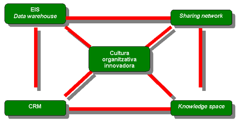 Nosaltres considerarem que aquests dos sistemes, juntament amb el sistema d'informació EIS, el foment de la formació contínua, la cultura col·laborativa i els sistemes de gestió de la relació amb els clients (CRM), són les peces bàsiques del nostre model de gestió del coneixement en una organització moderna.