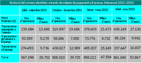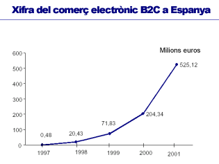 Després d'una època de multimilionàries inversions en projectes poc sòlids, i superada la panacea d'Internet com a mitjà enriquidor a curt termini, es va portant a terme un primer reajustament dels models de comerç electrònic implantats durant aquest estadi que encara no s'ha acabat. Es va produint un reajustament en els serveis i productes d'un mercat que aparenta manques d'adaptació a la societat de la informació o, com algunes empreses han assenyalat en el moment del tancament dels seus projectes de comerç electrònic, un mercat immadur per a les apostes tecnològiques desenvolupades. Ara bé, aquestes notícies descoratjadores fan referència al creixement global d'Internet, no a les dades de comerç tal com apareixen als diferents estudis i anàlisis del mercat electrònic. Aquests indiquen i aposten pel comerç electrònic com a motor de creixement i influència en l'economia actual, com podem comprovar en l'estudi de l'Associació Espanyola de Comerç Electrònic amb la col·laboració del Ministeri de Ciència i Tecnologia (figura 1) i en el vuitè informe sobre comerç electrònic a Espanya a través d'entitats de mitjans de pagament (taula 1).