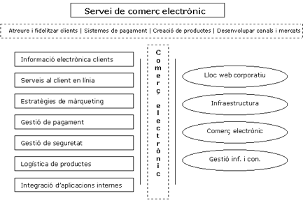 El comerç electrònic, juntament amb les aplicacions de negoci electrònic, comprèn tots els processos amb els diferents actors de l'activitat empresarial i comercial (distribuïdors, proveïdors, clients, socis, treballadors, etc.), incloent-hi accions com vendes, màrqueting, registre, lliuraments, pagaments, captació, fidelització, etc. Això implica l'ús d'aplicacions molt diverses, entre d'altres: TPV (terminals punt de venda, caixers, generalment connectats a una xarxa; en aquest article ens referim als TPV virtuals, per Internet), serveis de sindicació (venda d'informació preseleccionada), serveis a mida, aplicacions EDI, sistemes ERP (Enterprise Resource Planning, planificació de recursos empresarials), CRM (Client Relationship Management, gestió de les relacions amb els clients), gestió d'informació i sistemes col·laboratius (taula 2).