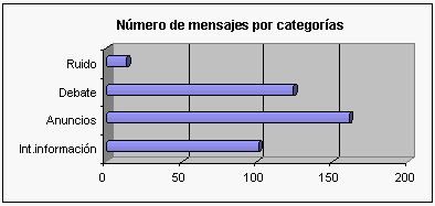 Con los resultados del análisis se establecieron cuatro clases y once subclases temáticas. Atendiendo al contenido de los mensajes y siguiendo las propuestas realizadas por McElhearn y Ontalba, reunimos los mensajes en cuatro grupos: intercambio de información, anuncio, debate y ruido. La categoría que suma más mensajes son los anuncios, con un 41% sobre el total de mensajes producidos; el 59% de los anuncios fue producido por los alumnos, frente al 41% del profesorado. El siguiente grupo con mayor número de mensajes es el debate, con un 31%, seguido por el intercambio de información, con un 25%. Por último, se generó un 3% de ruido en los mensajes, como se puede observar en el gráfico que indica el número de mensajes por categorías.