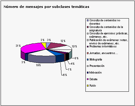 Para finalizar, se muestra un gráfico circular con los porcentajes de las once subcategorías establecidas, donde destacan tres grupos de subclases a partir del número de mensajes generados. El primer grupo lo componen el debate seguido de la presentación de profesorado y alumnos; el segundo grupo lo forman la consulta de contenidos de la asignatura, contenidos de exámenes y consultas de bibliografía; finalmente, el tercer grupo se refiere a un número muy homogéneo de mensajes de consulta de contenidos no docentes, publicación de exámenes, problemas informáticos, jornadas-encuentros y motivación.