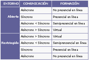 La tabla que se expone a continuación nos muestra cómo la relación entre entorno, sistema de comunicación –sincronía y asincronía– y modalidad de formación es una relación plural y rica en dinamismo formativo. No se trata de establecer parámetros de relación mejores que otros, sino de mostrar que la diversidad está ahí y que la modalidad que se escoja dependerá siempre de los objetivos de aprendizaje y de las necesidades personales de quien decide formarse.