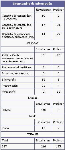 b) Consulta de contenidos de la asignatura: se trata de mensajes a partir de contenidos o sobre contenidos de la materia impartida en el aula.