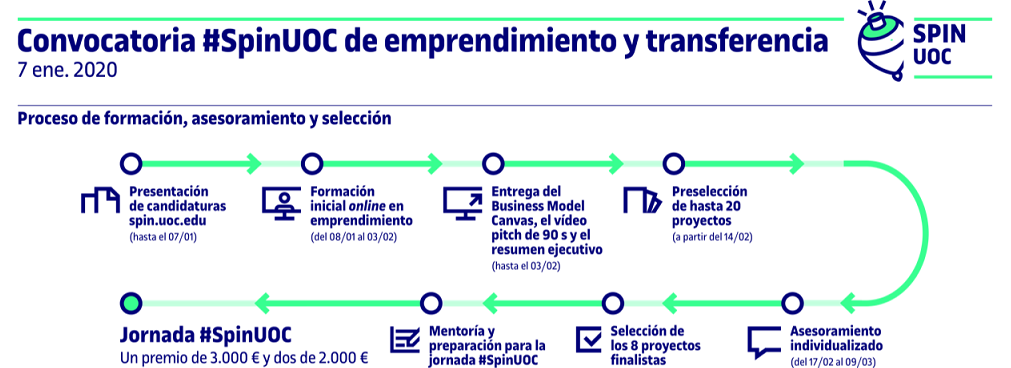 El proceso de inscripción de propuestas empieza con la publicación de estas bases y se cierra el 7 de enero de 2020. En caso de que tengáis un proyecto que cumpla los criterios #SpinUOC, solo hay que rellenar este formulario en línea y presentarlo.